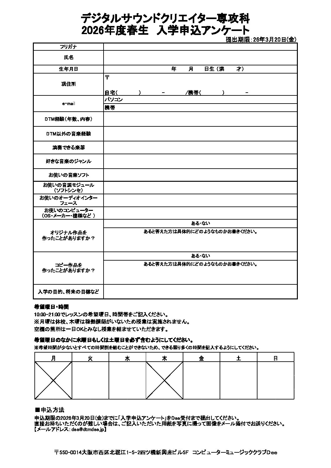 「入学申込アンケート」をDee受付まで提出してください。